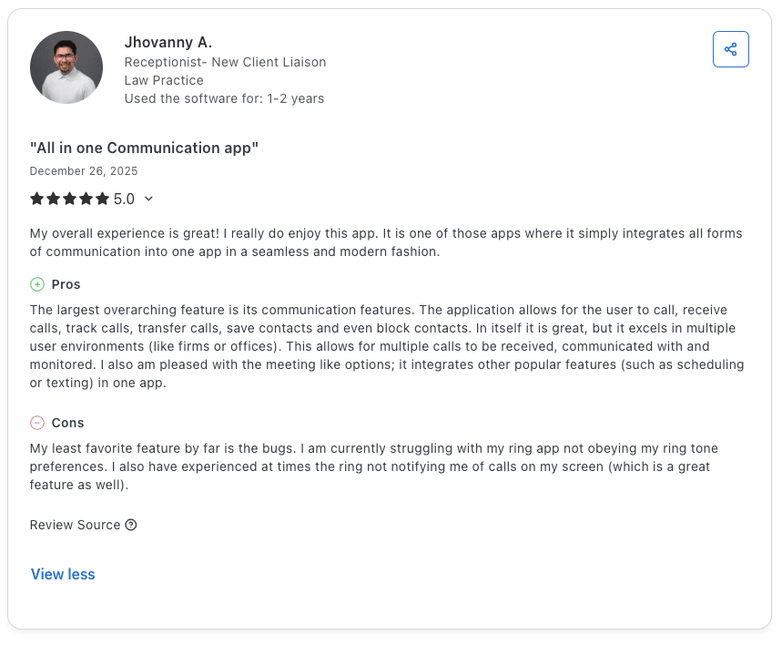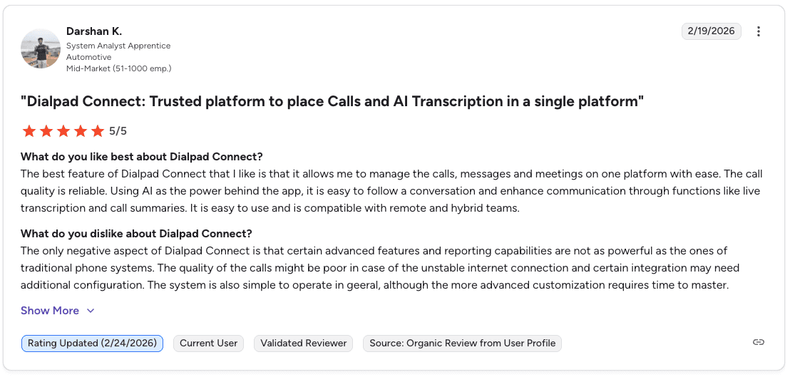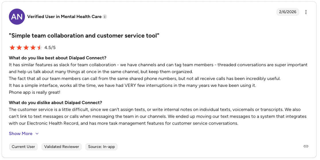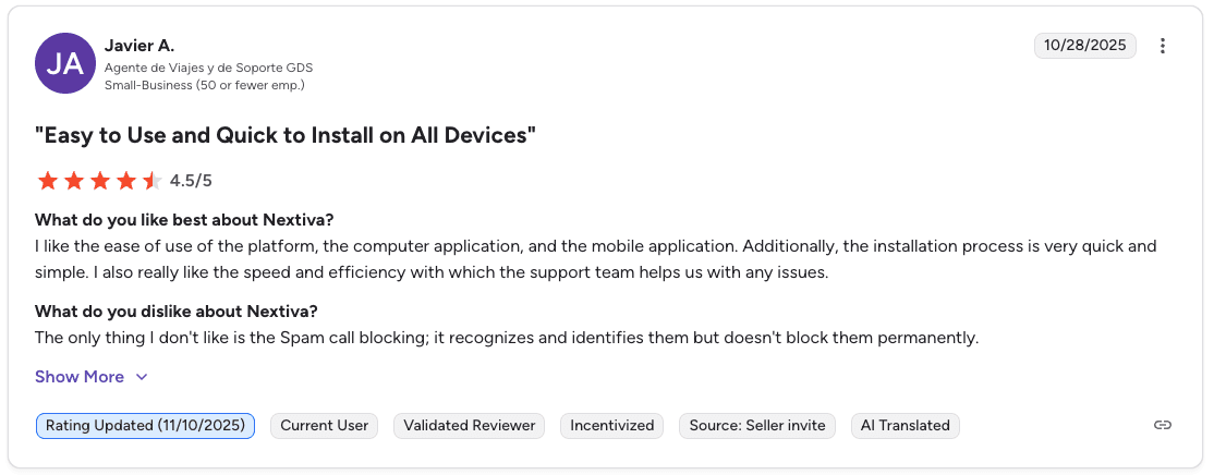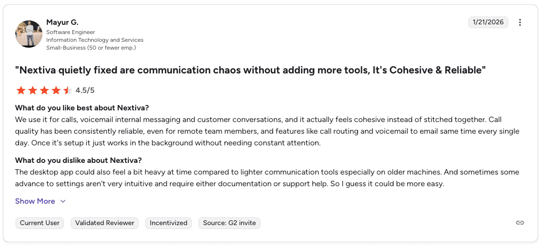 Pro: "Nextiva handles calls, voicemail, internal messaging, and customer conversations in one place. Call quality has been reliable for remote team members, and once it's set up, it runs in the background without needing constant attention." β Mayur G., G2