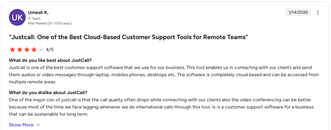 Pro: "JustCall is completely cloud-based and can be accessed from multiple remote locations. It enables contacting clients and sending audio or video messages across laptops, mobile phones, and desktops." β Umesh K., G2