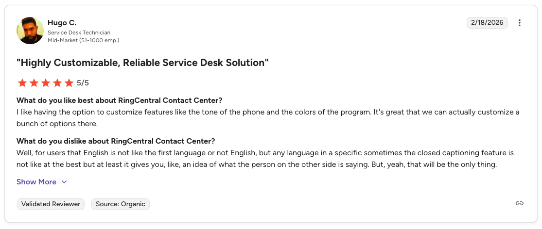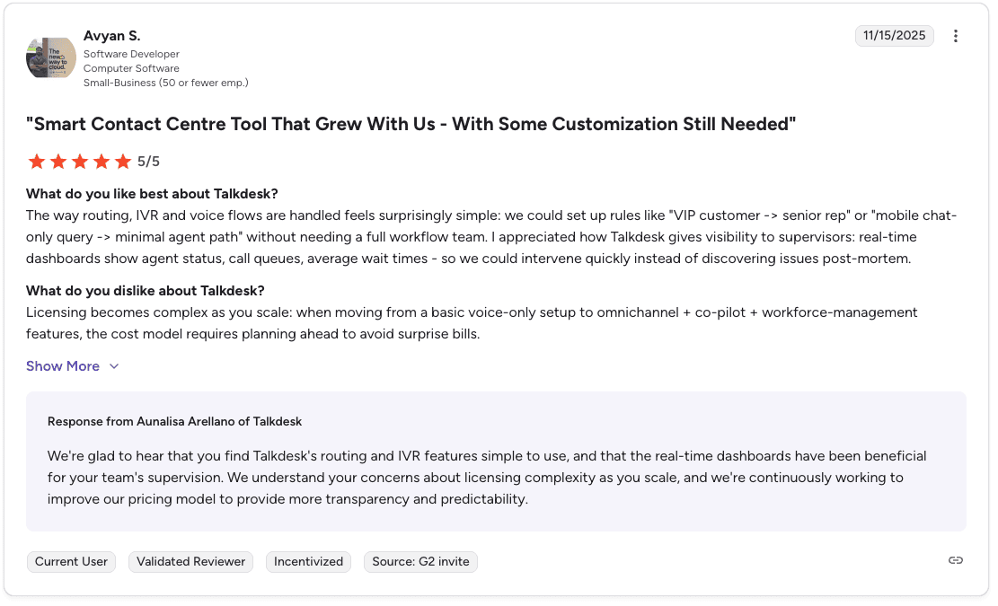 Con: "Licensing becomes complex as you scale. Moving from a basic voice-only setup to omnichannel and workforce management features requires planning ahead to avoid surprise bills." β Avyan S., G2
