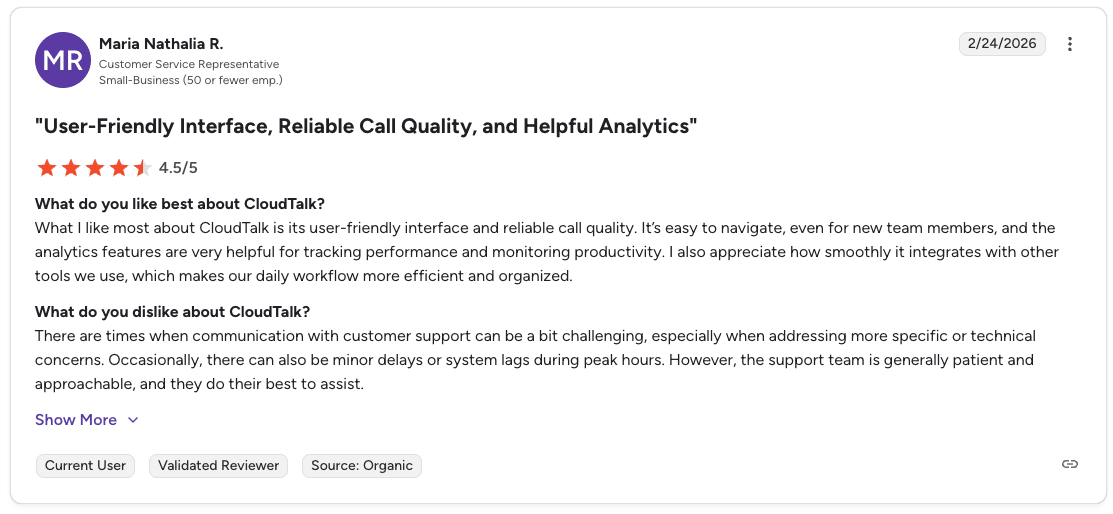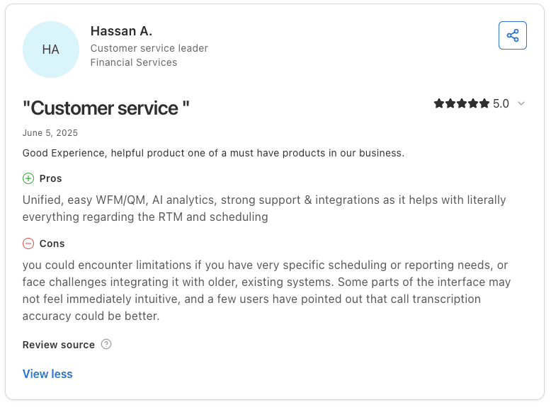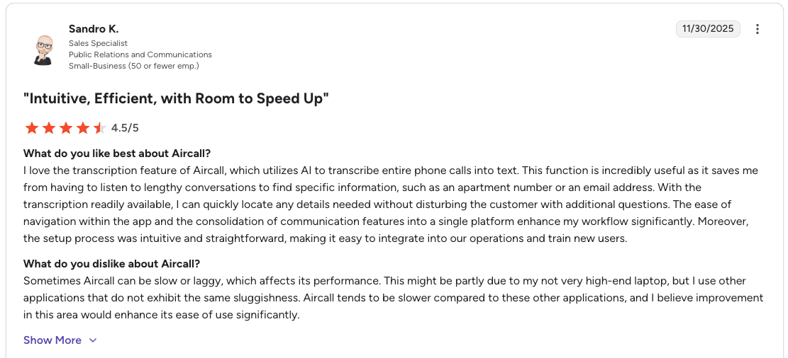 Con: "There are limitations if you have specific scheduling or reporting needs, and integrating with older existing systems can be challenging. Some parts of the interface are not immediately intuitive, and call transcription accuracy could be better." β Hassan A., Capterra