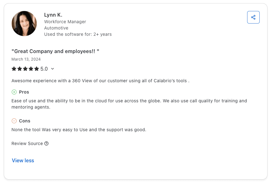 Pro: "Calabrio is easy to use and cloud-based, so teams can access it from anywhere. We use call recordings for training and mentoring agents." β Lynn K., Capterra