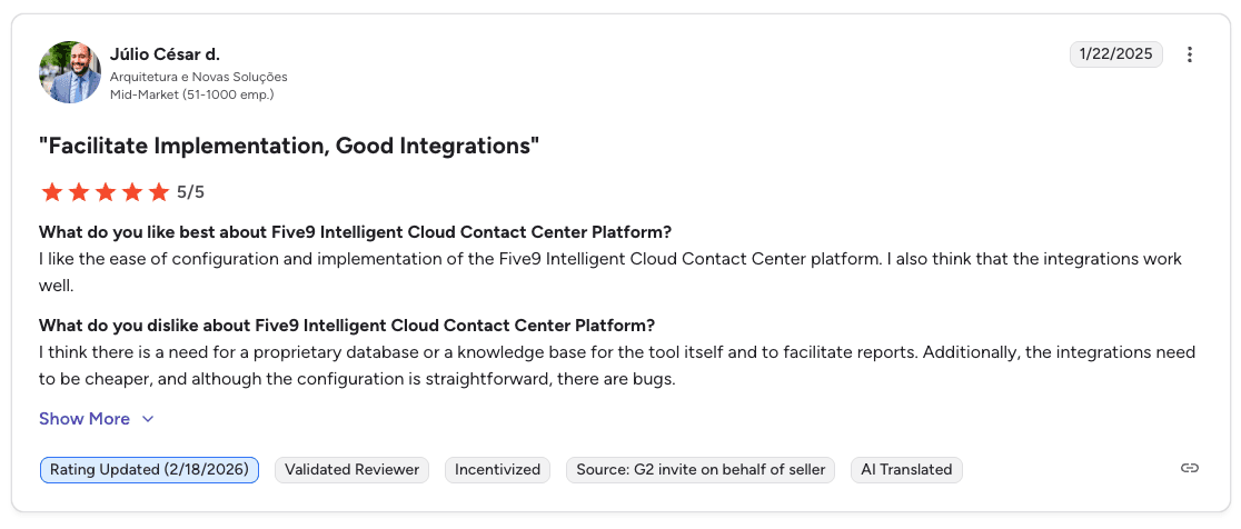 Pro: "I like the ease of configuration and implementation. The integrations work well." β JΓΊlio CΓ©sar d., G2 Review