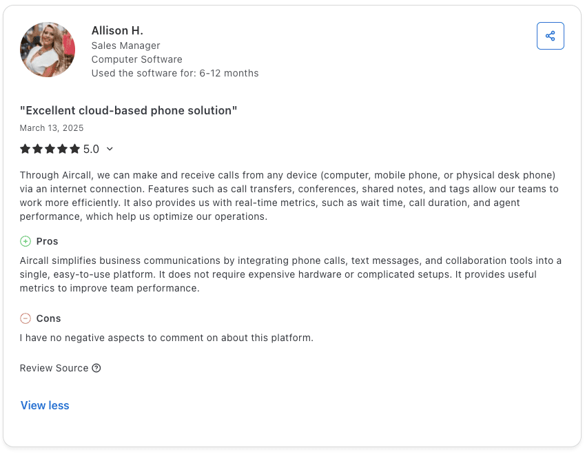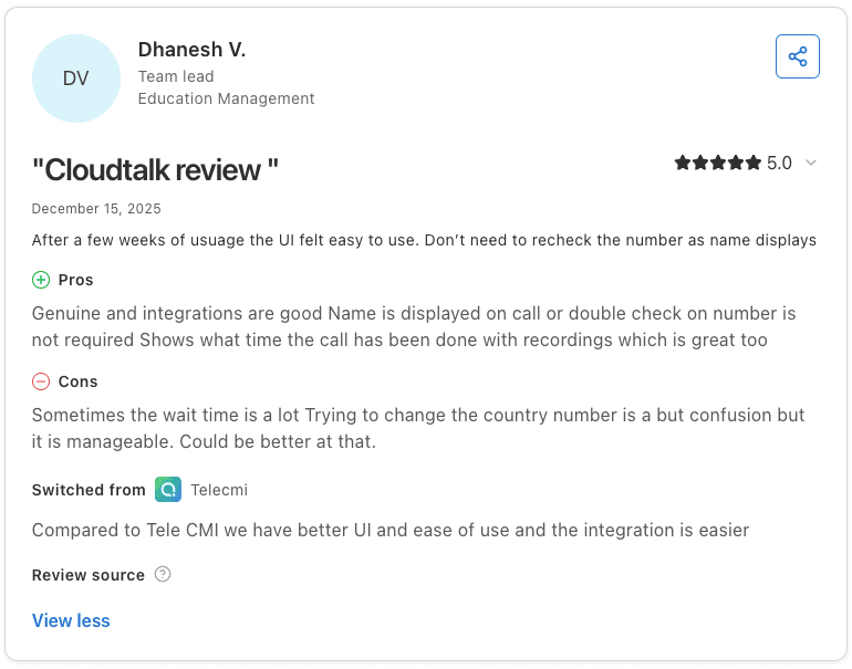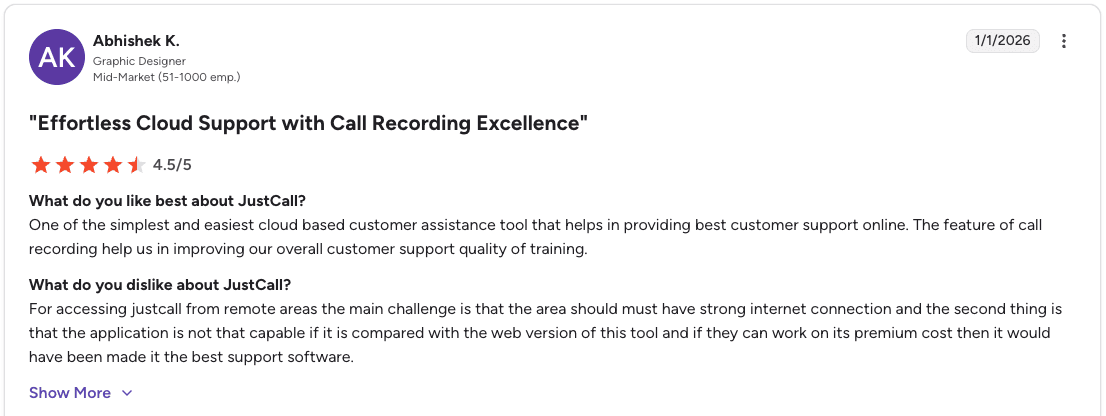 Con: "Accessing JustCall from remote areas requires a strong internet connection. The mobile app is less capable compared to the web version." β Abhishek K., G2