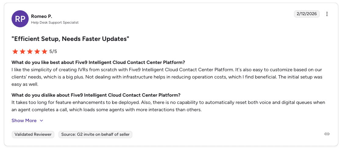 Con: "It takes too long for feature enhancements to be deployed. There is no capability to automatically reset voice and digital queues when an agent completes a call, which loads some agents with more interactions than others." β Romeo P., G2