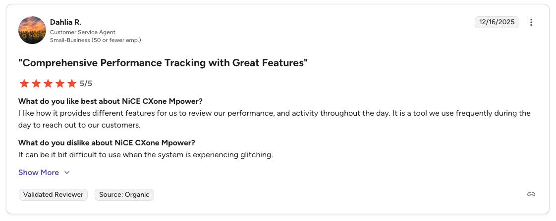 Pro: "It provides different features to review performance and activity throughout the day. It's a tool we use frequently to reach out to customers." β Dahlia R., G2