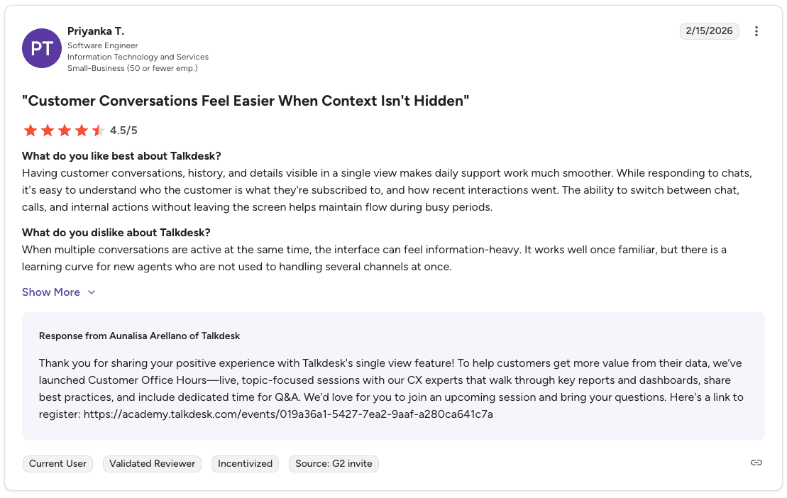 Pro: "Having customer conversations, history, and details visible in a single view makes daily work much smoother. Switching between chat, calls, and internal actions without leaving the screen helps maintain flow during busy periods." β Priyanka T., G2